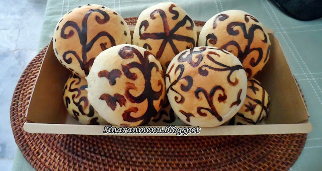 7- Jika and ingin melukis corak diatas permukaan bun ini, Bakar roti separuh masak (permukaannya sudah kelihatan sedikit keperangan), keluarkan dari oven dan lukis corak yang disukai diatasnya. Bakar semula lebih kurang 10 minit atau hingga permukaan roti kelihatan perang dan bun boleh dikeluarkan dari dulang dengan senang.